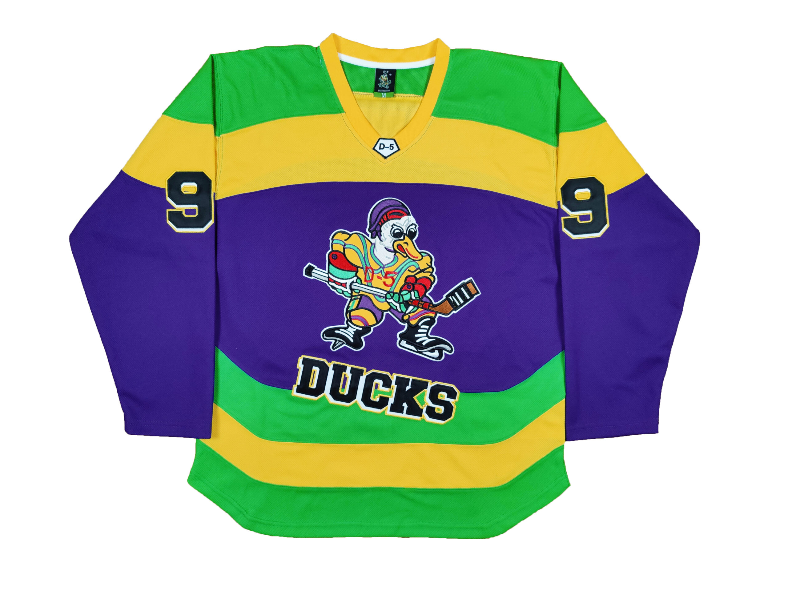 Combine your love of sports, streetwear and nostalgia by copping the Adam Banks Ducks #99 purple Hockey Jersey. This bold jersey features contrast panelling and striping all throughout and embroidered team logos on the sleeves and front and centre. Don’t sleep on this iconic hockey jersey, available now at Legendshop while stock lasts!